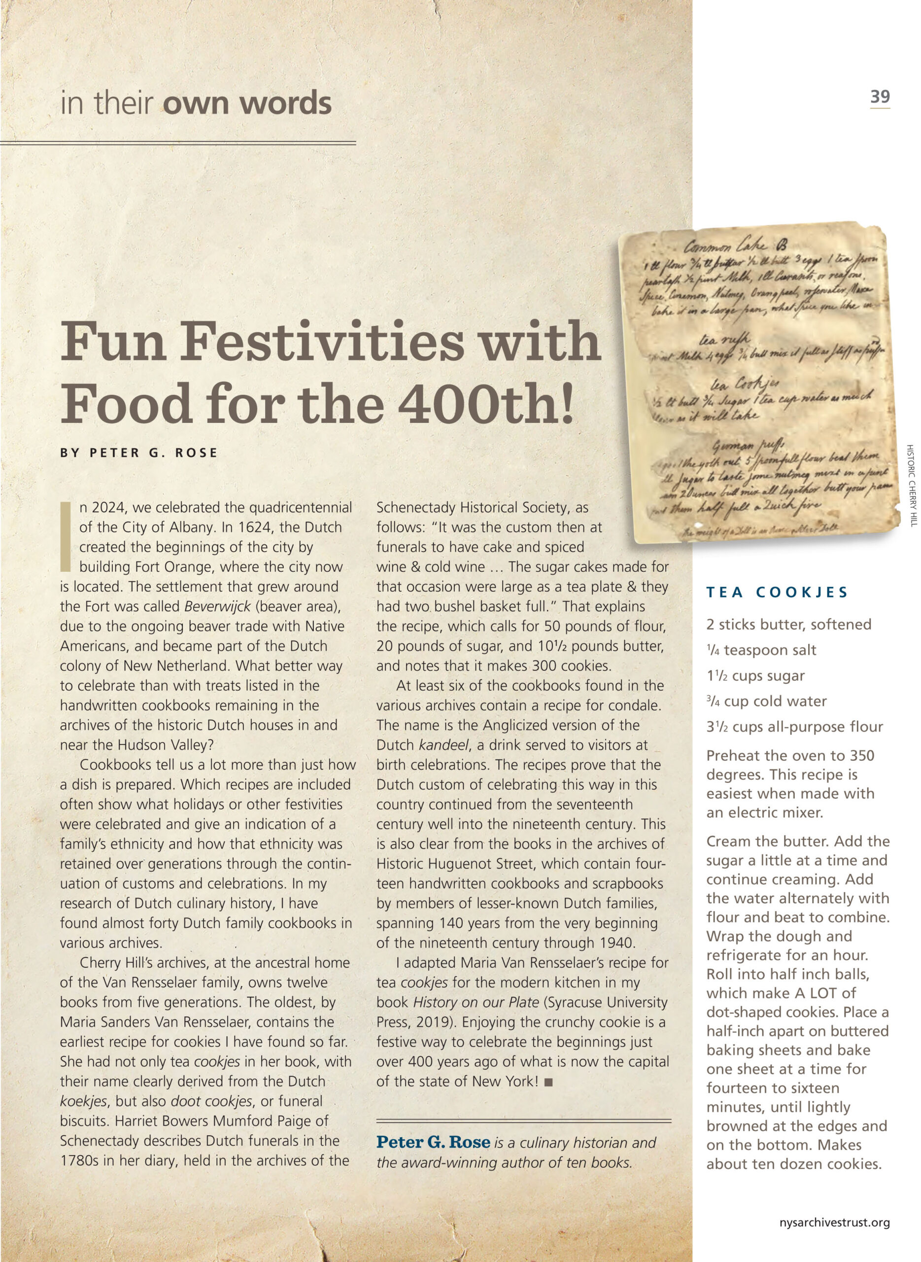 Peter G. Rose, a culinary historian and the award-winning author of ten books, celebrated the 400th anniversary of Albany exploring recipes in cookbooks found in the city’s Dutch houses. Below is her portrait of what she has found.