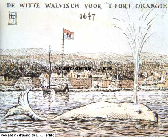 [52] On the 29th of March in the year 1647 a certain fish appeared before us here in the colony, which we estimated to be of a considerable size. He came from below and swam past us a certain distance up to the sand bars and came back towards evening, going down past us again. He was snow-white, without fins, round of body, and blew water up out of his head, just like whales or tunas. It seemed very strange to us because there are many sand bars between us and Manhattan, and also because it was snow-white, such as no one among us has ever seen; especially, I say, because it covered a distance of 20 [Dutch] miles of fresh water in contrast to salt water, which is its element. Only God knows what it means. But it is certain, that I and most all of the inhabitants [watched] it with great amazement. On the same evening that this fish appeared before us, we had the first thunder and lightening of the year.